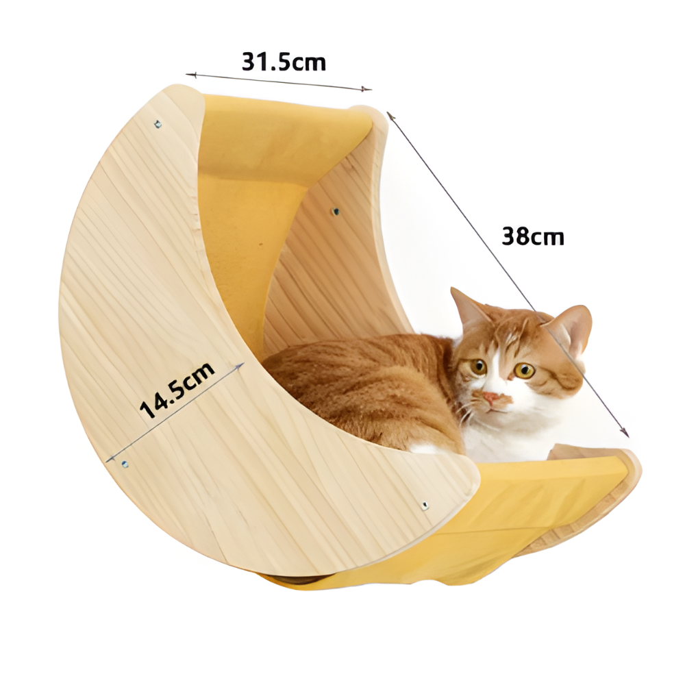 ערסל קיר בצורת ירח עוטף את החתול בעדינות ומדמה נקודת מנוחה גבוהה כמו ענף עץ בטבע. משם הוא יכול להשקיף, לנמנם, ולהרגיש שהוא שייך.