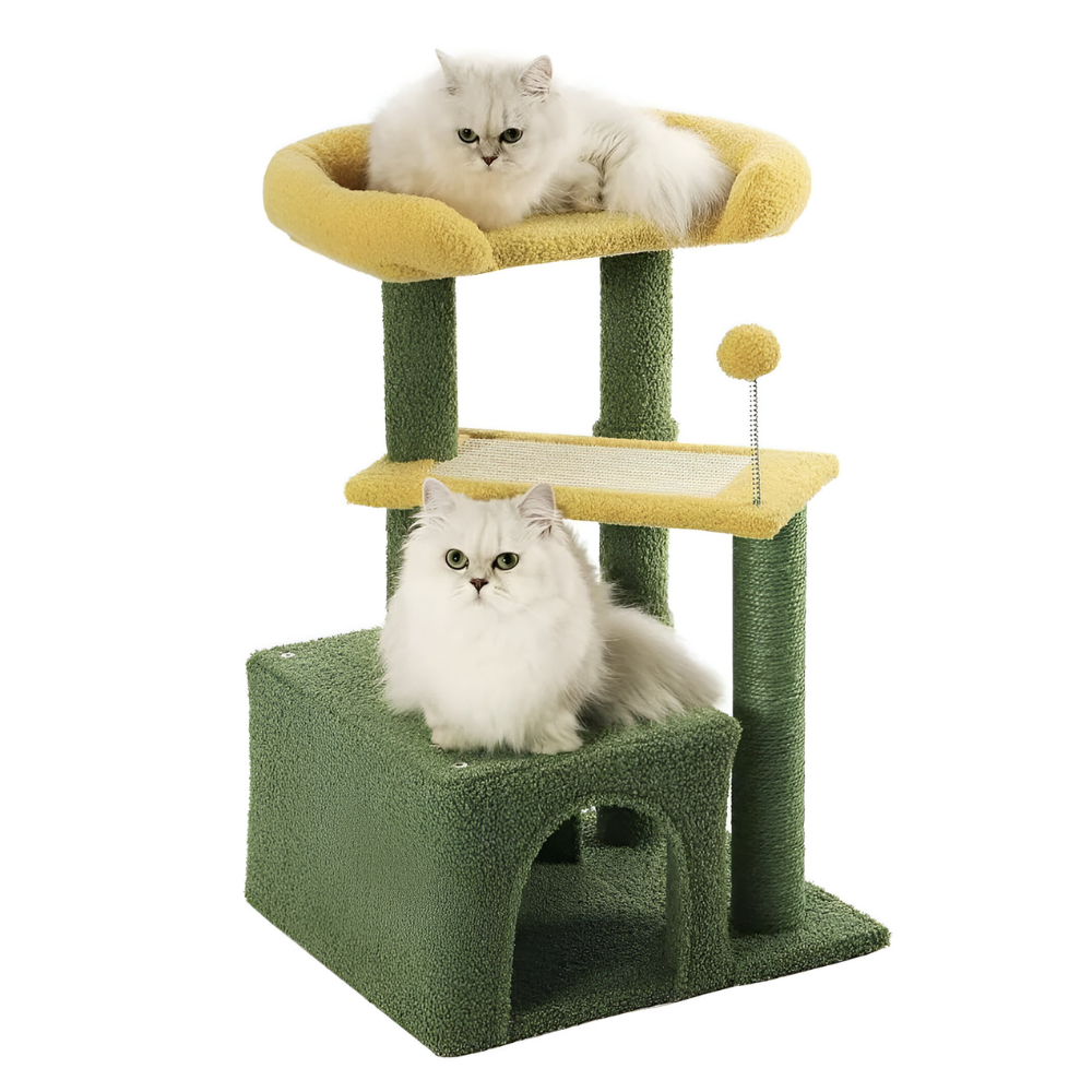 מתקן גירוד לחתול עם בית מסתור, פינת ישיבה, איזור גירוד וערסל תצפית. מתאים ל2-3 חתולים בבית. מתאים לבתים בינוניים בהם חיסכון במקום הוא דבר חשוב.